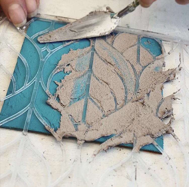 В прорези этого универсального инструмента удобно наносить краску различными способами: спонжем, круглой кистью или аэрографом. Трафарет легко вдавливается в глину, а также подходит для декоративной штукатурки. Для нанесения акриловых фактурных гелей наилучшим способом является использование шпателя, который также удобно использовать для удаления излишков краски без повреждения трафарета.