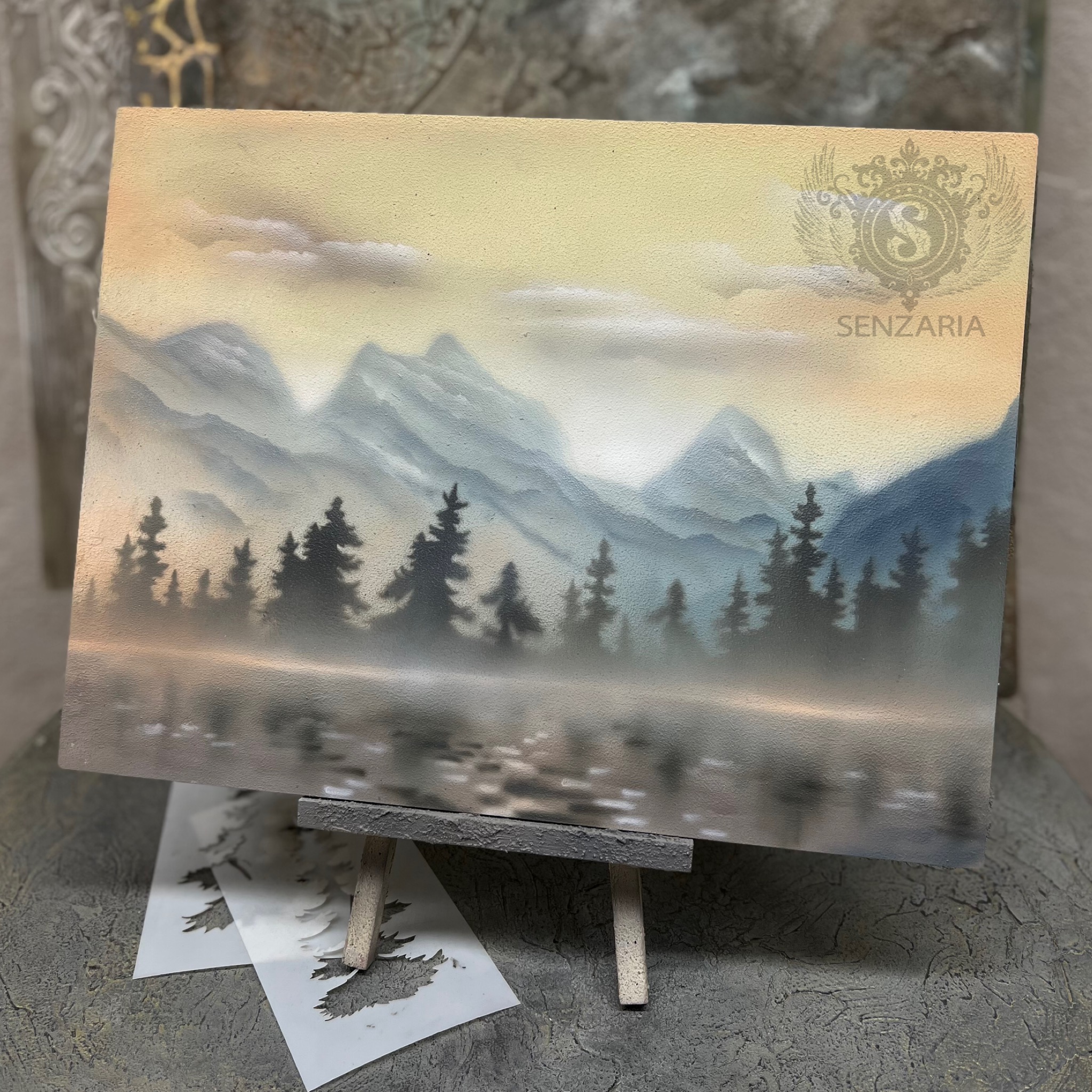 Серия трафаретов для создания самых правдивых туманных горных хвойных лесов в технике градиента. Вы можете использовать тонкие трафареты 0,3мм для нанесения краски спонжем или аэрографом, а так же потолще от 0,7мм для работы со штукатуркой. Трафареты в двух дизайнах из двух частей каждый - вырезка елей внутри поля и отдельная внутренность для создания тумана.